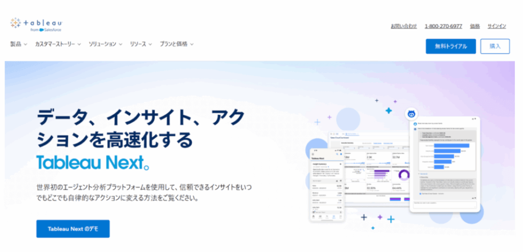 | 主な機能 | – 直感的なドラッグ&ドロップ操作によるデータ可視化 – 豊富なデータコネクタ(クラウド・オンプレ対応) – ダッシュボード共有・チームコラボレーション – AIを活用した予測分析・自然言語クエリ- モバイル対応 |